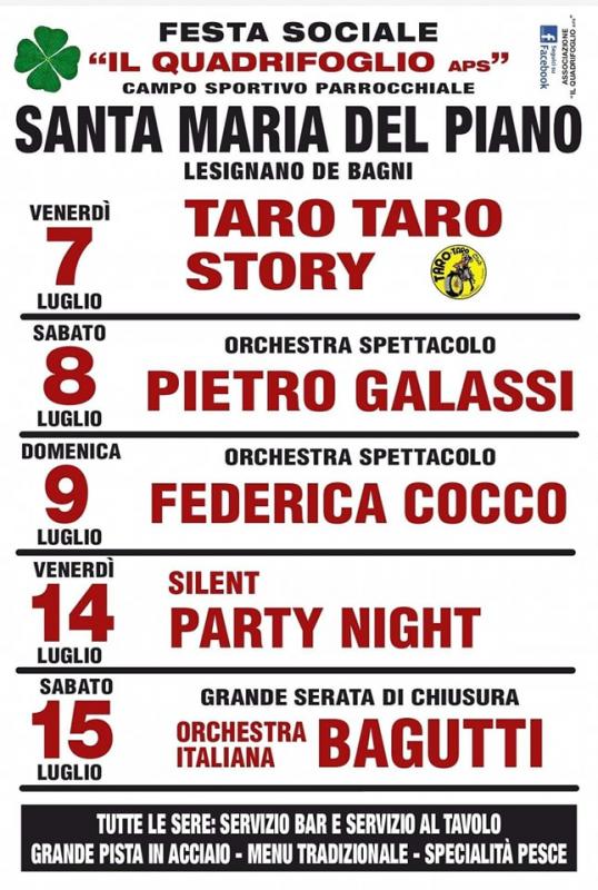 Tutte le serate si terranno presso il Campo Sportivo di Santa Maria del Piano in Lesignano de' Bagni (PR)