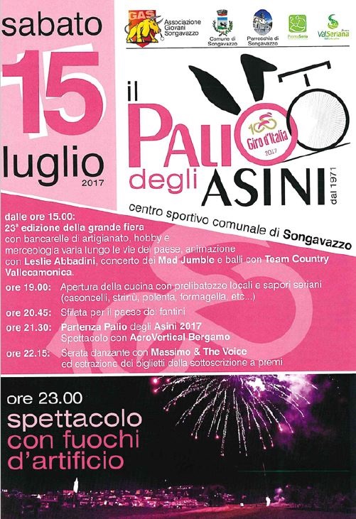 Ci sono manifestazioni che fanno ormai parte integrante dell'estate bergamasca. E tra queste certamente il Palio degli Asini di Songavazzo, evento clou del weekend dedicato alla Madonna del Carmine, protettrice del piccolo borgo seriano. La simpatica competizione si inserisce infatti nella due giorni in cui il paese venera e celebra la splendida statua mariana realizzata dal celeberrimo Andrea Fantoni nel '700, e collocata nella parrocchiale di San Bartolomeo. Il programma della festa è ormai consolidato.