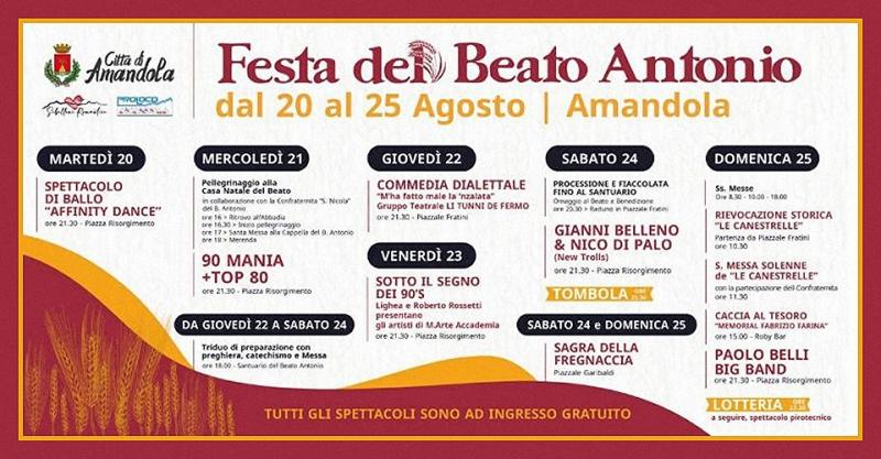 Il Beato Antonio si festeggia con un ricco programma di spettacoli tutti ad ingresso gratuito, con la tradizionale rievocazione storica “Le canestrelle”, con la lotteria e lo spettacolo pirotecnico