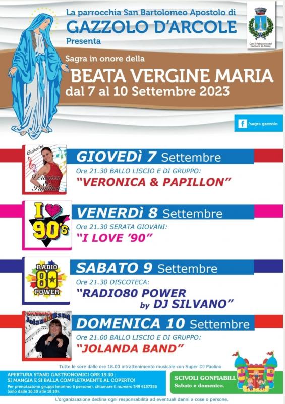 A Gazzolo, frazione del Comune di Arcole, in provincia di Verona si svolge nei giorni dal 7 al 10 Settmbre 2023 la Sagra in Onore della Beata Vergine Maria.
