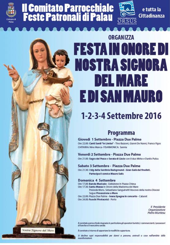 Il Comitato Parrocchiale Feste Patronali di Palau e tutta la cittadinanza organizza la Festa in onore di Nostra Signora del Mare e di San Mauro nei giorni 1-2-3-4 Settembre 2016.