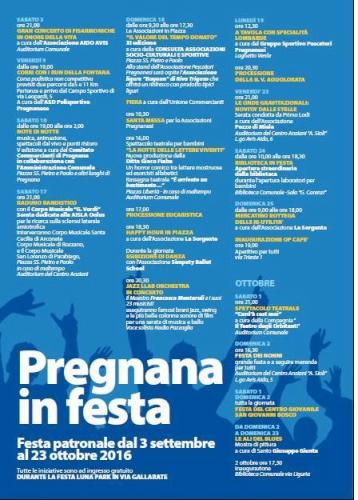 Pregnana In Festa 2016. La Festa Patronale di Pegnana Milanese si tiene dal 3 settembre al 23 ottobre 2016 con una serie di eventi organizzati e patrocinati dall'amministrazione comunale.