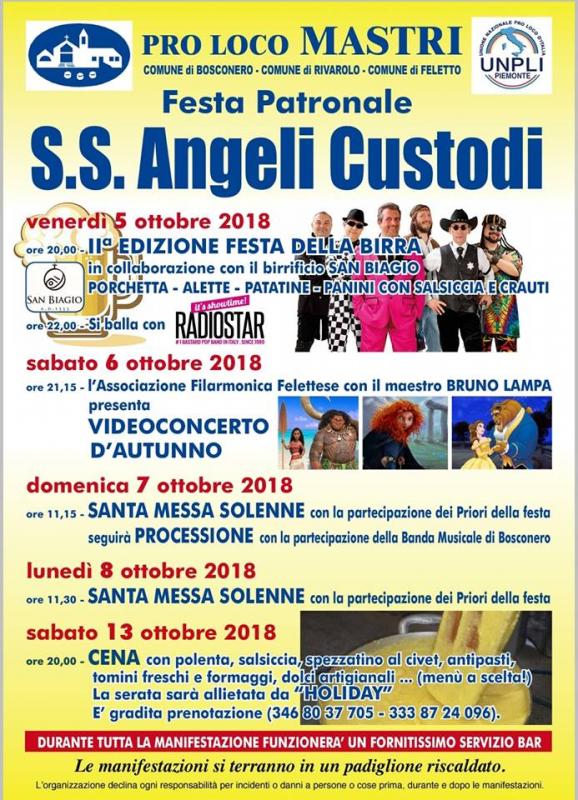 Gli eventi della Festa Patronale S.s. Angeli Custodia Mastri, frazione di Rivarolo Canavese (TO), si svolgono nei giorni 5, 6, 7, 8, 13 ottobre 2018.