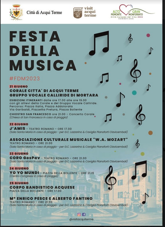 𝑭𝑬𝑺𝑻𝑨 𝑫𝑬𝑳𝑳𝑨 𝑴𝑼𝑺𝑰𝑪𝑨 di Acqui Terme ospiterà vari concerti di REALTÀ MUSICALI ACQUESI