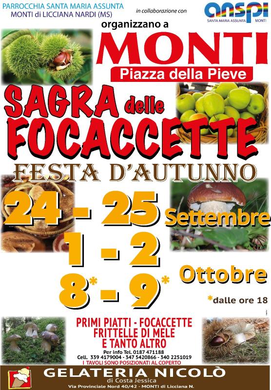 la Festa d'Autunno e La Sagra delle focaccette a Licciana Nardi (Ms) si volge a Monti frazione del comune il 24 e 25 settembre e il 1-2 - 8-9 Ottobre 2022
