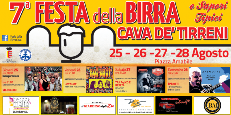 Ritorna la Festa della Birra nella splendida Cava de' Tirreni (Sa) per il settimo appuntamento con l'allegria, la musica live ,fresche birre di ogni tipo e prelibatezze gastronomiche.
