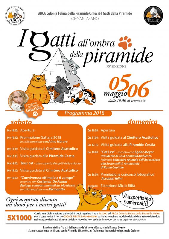 Oltre a vedere il meraviglioso sito archeologico e la Piramide Cestia e il Cimitero Acattolico (visite guidate; la Piramide: sabato alle 12.15 e domeica alle 12; il Cimitero Acattolico sabato: alle 11.15 e alle 15 e domenica alle 11), giocheremo insieme con il premio della MiciaRiffa e si svolgeranno le votazioni del concorso fotografico “Acrobati felini” (con premiazione finale). Alle 14.00 di sabato 5 maggio con il Tour Cat potrete conoscere le storie, e avere un incontro ravvicinato, con i gatti che vivono nella colonia di Piramide.
