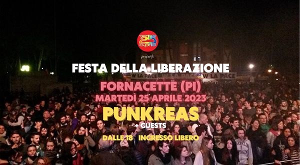 Tutto pronto per martedì 25 aprile, giorno in cui si terrà la diciannovesima edizione della Festa della Liberazione a Fornacette in provincia di Pisa, organizzata dalla locale associazione Comitato 25 Aprile. Quest’anno l’evento principale è rappresentato dal concerto dei Punkreas. Prima di loro, sul palco saliranno Quartiere Coffee, Bambole di Pezza e Masu. La manifestazione, che si svolgerà come da tradizione in Piazza della Resistenza, inizierà nel pomeriggio con l’apertura degli stand del mercatino artigianale. A partire dalle 18 la manifestazione si sposterà sul palco centrale, con l’inizio dei concerti. L’ingresso all'area e ai concerti - come sempre - è gratuito. L'evento, patrocinato dal Comune di Calcinaia e dalla Regione Toscana, con la collaborazione di Punto Radio e Salty Music APS, sarà anticipato nella mattinata dalle commemorazioni ufficiali delle autorità presso il Palazzo Municipale di Calcinaia e la deposizione delle corone in memoria dei caduti in vari luoghi e monumenti del territorio.