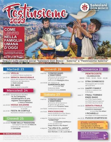 dal 23 al 28 maggio 2023 prende il via la XXXVIII edizione di “Festinsieme”, la grande festa del quartiere Carmine e della città di Salerno che da oltre 35 anni è organizzata dai Salesiani in concomitanza della Festa di Maria Ausiliatrice. Sin dall’inizio, nel 1983, la Festa ha avuto un grande riscontro, caratterizzandosi per un programma ed una formula che nel corso degli anni non sono variati di molto, mantenendo salde le peculiarità di un cartellone senza eventi faraonici ma con grande partecipazione delle diverse realtà del territorio, con il coinvolgimento delle associazioni, del volontariato, delle attività produttive. Una Festa nata nel quartiere che con il tempo si è aperta all’intera città.