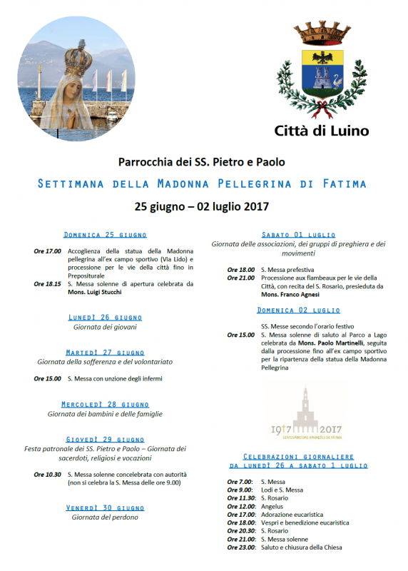 Inoltre il 25 giugno 2017 sarà a Luino la Madonna di Fatima in occasione della Festa Patronale.