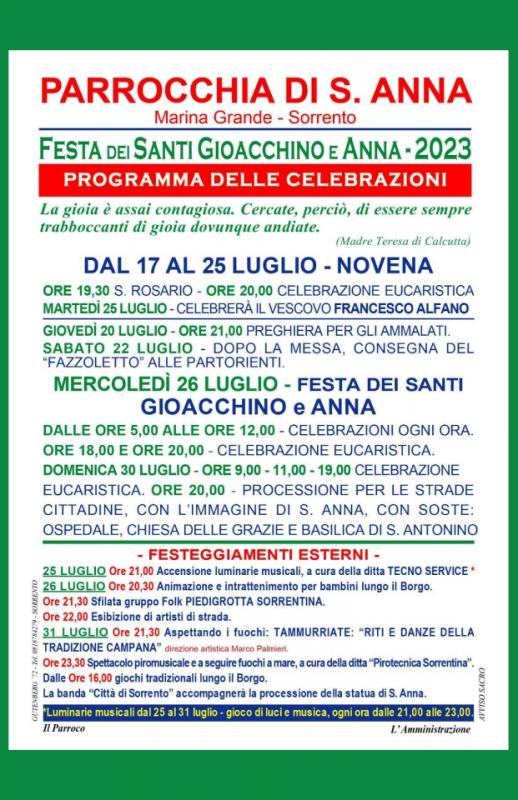 Dal 17 al 26 Luglio 2023 si svolgono gli eventi della Festa dei Santi Anna e Gioacchino organizzati dalla Parrocchia di S. Anna Marina Grande.
