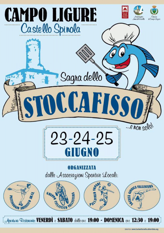 Il Comune e le Associazioni Sportive di Campo Ligure Vi invitano alla tradizionale “SAGRA DELLO STOCCAFISSO” che si svolgerà, come di consueto, presso il Castello Spinola a Campo Ligure nelle giornate del 23, 24, 25 giugno 2017.