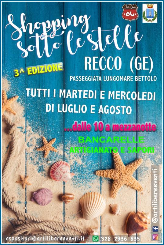 Shopping Sotto le Stelle, ritorna per il terzo anno a Recco (GE), tutti i Martedì e Mercoledì dal 05 Luglio al 31 Agosto 2022, dalle ore 10.00 alle ore 23.00, sul Lungomare Bettolo.