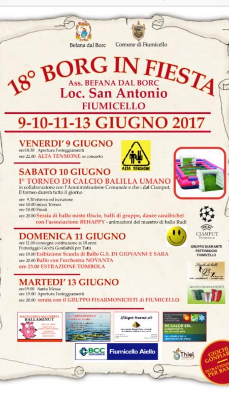 la 18°edizione di Borg In Fiesta si svolge nei giorni 9, 10, 11, 13 giugno 2017 a Borgo Sant'Antonio diFiumicello