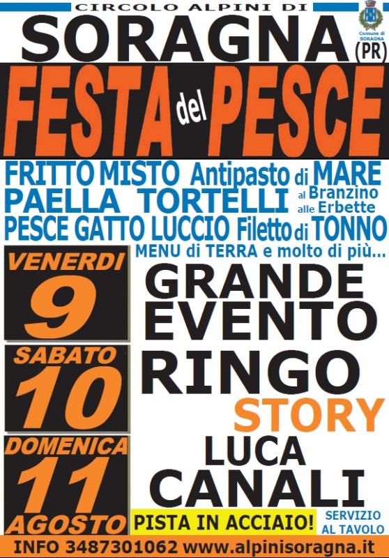 Nel parco verde dell’Area Feste di via Veneto a Soragna si rinnova l'appuntamento con la grande Festa del Pesce a Soragna nei giorni 9, 10 , 11, 12 agosto 2024 , giunta alla 18esima edizione, serate gastronomiche e musicali a cura del Circolo Alpini di Soragna con menù a base di pesce di mare, d'acqua dolce e menu di terra.