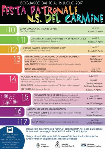Dal 15 al 20 Luglio 2019 si tengono gli eventi per la Festa di N.S. del Carmine a Bogliasco, Patrona della città, che avrà il suo culmine domenica 16 luglio.