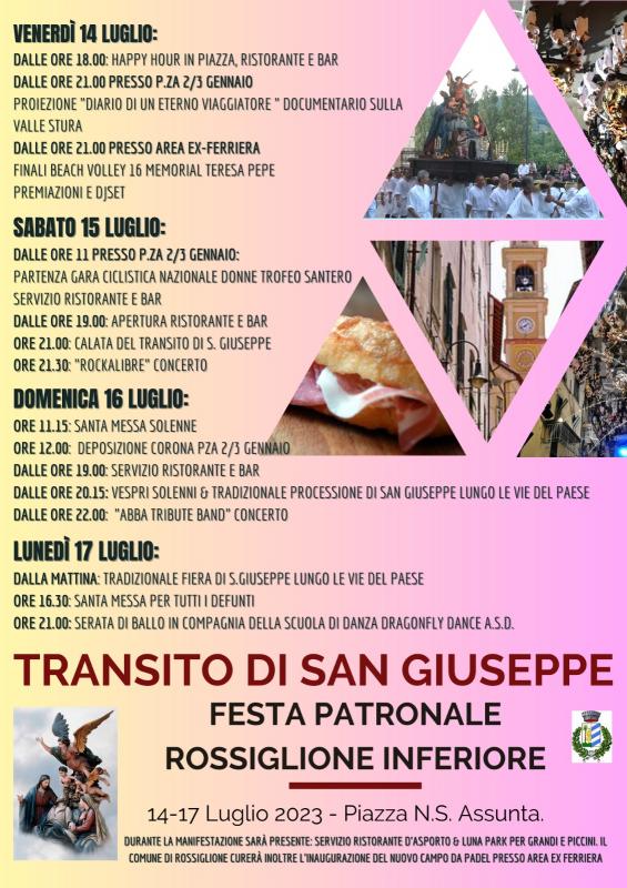 Come ogni anno, dal 14 al 17 luglio torna la festa patronale del Transito di San Giuseppe a Rossiglione. L'appuntamento è in piazza 2/3 gennaio per quattro giorni di attività, gastronomia, buona musica e tanto altro!
