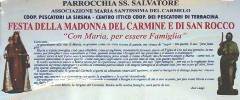 Per ritornare allo statuto della Confraternita, nel capitolo secondo sono elencate le funzioni religiose, divise in due classi: le obbligatorie, cui tutti sono tenuti a partecipare; le non obbligatorie, giacché dipendenti dalla volontà dei Superiori e a richiesta dei Benefattori, per le quali si stabilivano i turni di partecipazione. Alla prima categoria appartiene la festa del Carmine, stabilita per la terza domenica di Luglio, introdotta dal canto del "Te Deum" e preceduta da un settenario per commemorare le sette allegrezze della Madonna: in sostanza i misteri gaudiosi e gloriosi del S. Rosario. La festa del Carmine, come festa del quartiere della Marina, ha sempre avuto un rapporto culturale con il mare, ma quando all'inizio del secolo scorso la Madonna del Carmine è stata eletta patrona dei pescatori, questo rapporto è divenuto esplicito. Si deve però ricordare che San Rocco è il compatrono dei pescatori, e solo negli anni '50 questa seconda festa della confraternita venne "fusa" con la festa del Carmine, per questo oggi San Rocco è portato in processione con la Madonna. Questa fu certamente una soluzione di ripiego, dettata soprattutto da ragioni economiche. Non è certo quando fu istituita nella parrocchia del Salvatore la festa di San Rocco, ma con molta probabilità ciò avvenne agli inizi del secolo scorso, difatti si trova menzionata per la prima volta nel secondo statuto della confraternita, redatto nel 1910. Un contributo notevole alla devozione verso il Santo degli appestati fu dato dai "Terellani", gli immigrati a Terracina dalle montagne di Cassino.