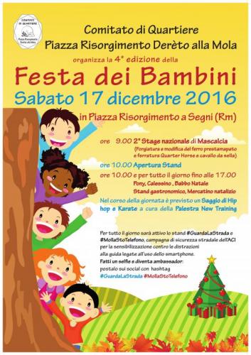 Sabato 17 dicembre dalle ore 9 nel piazzale antistante la scuola in Piazza Risorgimento, prenderà il via la quarta edizione della “Festa dei Bambini” organizzata dal Comitato di Quartiere “Piazza Risorgimento -derèto alla Mola” del Presidente Giovanna Speranza. Contemporaneamente è stato collocato, sempre in Piazza Risorgimento, il simbolo per eccellenza delle feste natalizie l'”Albero Segnino” decorato con ninnoli, nastri e fiocchi donati dagli abitanti di Segni su ognuno dei quali c'è scritto il cognome della famiglia, per essere appunto “l'albero di tutti”. E' partita così l'atmosfera di festa nelle strade del quartiere, e tutta la popolazione si sta mobilitando confermando sempre più sul territorio il gradimento dell'evento “A Natale puoi...” organizzato dall'attivo Comitato. Le conferme come sempre arrivano soprattutto da parte dei piccoli che sentono di più la magia del periodo, e che con la loro gioia e il loro entusiasmo ti coinvolgono talmente tanto da arrivare emotivamente a caricarti di responsabilità per organizzare un bell'evento. E questo poi è il segreto del successo: far contenti i bambini in una festa che è tutta per loro. Non esiste una formula magica, basta farsi abbracciare dallo spirito natalizio. “Quest'anno – ci spiega il Presidente – accanto alla tradizionale festa, di cui noi siamo stati i primi a pensare e a realizzare appositamente per i bambini, riproponiamo lo stage di mascalcia. Inoltre abbiamo pensato, accanto all'aspetto ludico, con un occhio al futuro, di sensibilizzare i bambini sulla sicurezza stradale. Si perché se è vero che i bambini non guidano, in futuro lo faranno e le buone abitudini si acquisiscono da piccoli. Inoltre magari osservando gli adulti alla guida che adottano comportamenti non consoni, potrebbero loro stessi fornire quell'input necessario e positivo al guidatore richiamando alle sue responsabilità. Quindi – conclude il Presidente - ci faremo promotori della campagna nazionale dell'Aci contro le distrazioni alla guida legate all'uso dello smartphone (messaggi, chat, selfie e foto), che causano il 75% degli incidenti e chi vorrà potrà venire allo stand, indossare la maglietta della campagna Aci, farsi un selfie e postarlo sui social con gli hashtag #mollastotelefono #guardalastrada e diventare ambassator della sicurezza”. Il tesoriere Patrizia Travagliati continua: “abbiamo pensato nella nostra festa, visto il successo dello scorso anno, con il pluripremiato Stefano Bonelli di inserire lo stage di mascalcia a livello nazionale: l'antica arte del maniscalco di produrre i ferri di cavallo e applicarli agli zoccoli delle bestie. E ancora troveremo pony e calessino per fare foto e girare con Babbo Natale. Infine – conclude il tesoriere – sul palco potremmo ammirare i giovani della palestra New Training in un bellissimo saggio di hip pop e karate. A colorare l'atmosfera di festa oggettistica natalizia artigianale e artistica.” Quest'anno il Direttivo, Alfio Marletta, Patrizia Travagliati, Daniela Mastronardi, Claudio Appetito, Federico Coluzzi, Mario Navarra e Maria Rita Spigone, può contare nell'organizzazione anche sul valido apporto delle nuove forze di Alessandro Circi, Roberto Coluzzi, Roberta Della Vecchia, Daniele Gagliarducci e Giulia, Valentina Rossi.