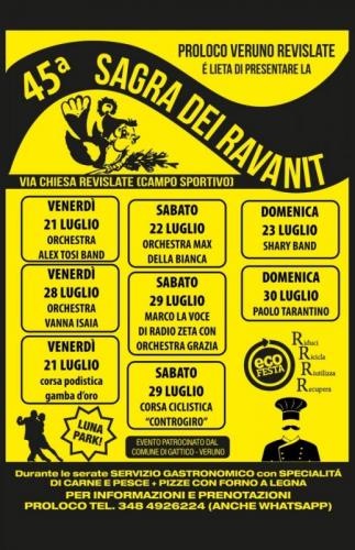 La Pro Loco Veruno Revislate invita alla 45a Sagra dei Ravanit a Revislate di Veruno (NO) che si svolge in due weekend: 21-22-23 e 28-29-30 Luglio 2023 in Via Chiesa.