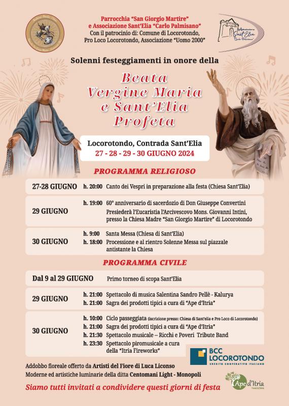 Solenni Festeggiamenti in onore della Beata Vergine Maria e Sant'Elia Profeta che si terranno a Locorotondo (BA) in contrada Sant'Elia il 27 - 28 - 29 - 30 Giugno 2024