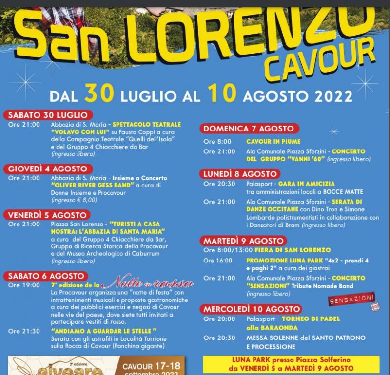 Cavour Festa Patronale di San Lorenzo dal 30 Luglio al 10 Agosto 2022