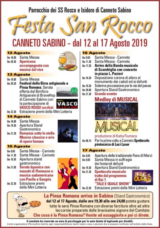 A Canneto Sabino, frazione del Comune di Fara in Sabina in provincia di Rieti si svolge nei giorni dal 12 al 17 Agosto 2019 la Festa Patronale di San Rocco.