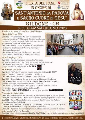 Ore 10.00 - Tuffati nel magico mondo dei giochi di MAGO TONY presso il campo sportivo comunale di Gildone Ore 17.00 - Santo Rosario - Ore 17.30 - Santa Messa Ore 18.30 - Benedizione del pane presso la Chiesa di San Rocco Ore 19.00 - Aperitiviamo in compagnia del SAX di Alessio Sabatino presso il campo sportivo comunale di Gildone Ore 19.30 - Apertura mostra fotografica "La festa di Sant'Antonio in Molise: usi e tradizioni" in via Roma,