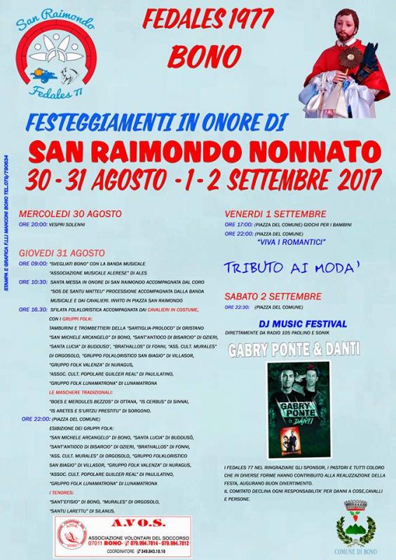 Il comitato di San Raimondo "Fedales 1977" organizza la festa in onore di San Raimondo Nonnato che si terrà a Bono nei giorni: 31 Agosto, 1, 2 settembre 2017.