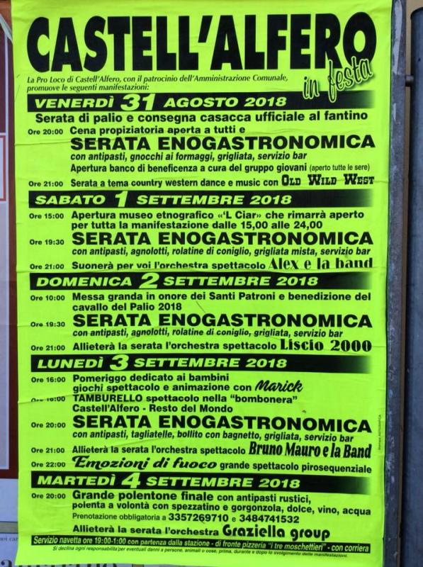 La Festa Patronale di Castell'Alfero, con serate enogastronomiche a cura della Pro loco di Castell’Alfero, si svolge nei giorni: 31 agosto, 1, 2, 3, 4 settembre 2018.