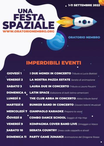 Oratorio Di Nembro In Festa Dal 1 al 11 settembre 2022 all'oratorio di nembro (BG) torna la festa che fa incontrare tutta la #comunità. Buona cucina - Musica - Animazione - Giochi e tante belle sorprese in 11 giorni all'insegna del sorriso e della voglia di continuare a camminare insieme.