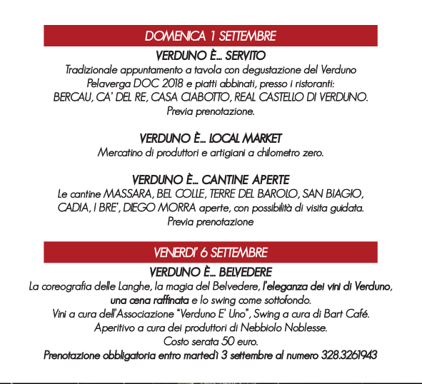 festa del Verduno Pelaverga DOC, che si svolgerà come di consueto la prima domenica di settembre, 1 settembre 2019, continuano le seguenti iniziative: