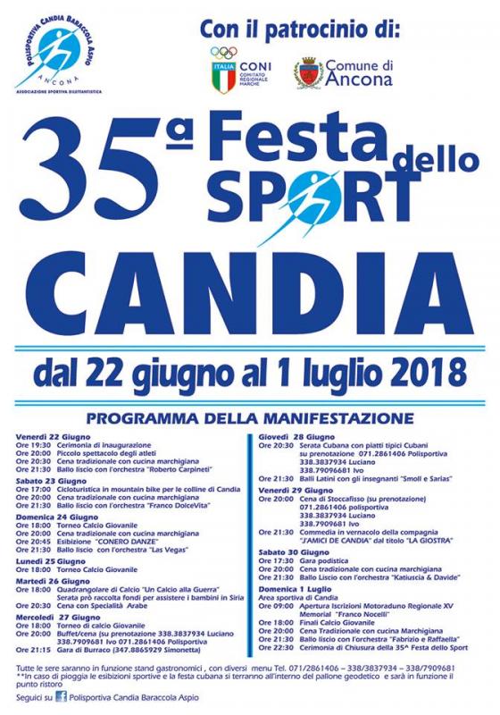Ritorna anche quest'anno dal 22 giugno all'1 luglio 2018 la Festa dello Sport di Candia giunta alla 35° edizione.