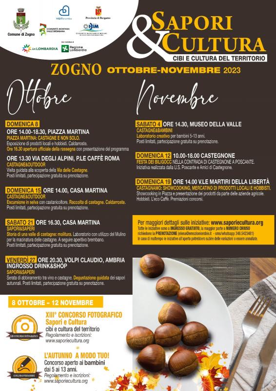 “Sapori&Cultura vuole essere una rassegna non solo di carattere culinario e di festa, ma una manifestazione che abbraccia anche il campo della promozione del territorio e della cultura locale- Spiega GiamPaolo Pesenti, assessore al turismo di Zogno- La castagna è stata una ricchezza per la popolazione locale e ci stiamo impegnando a non perdere la storia e la tradizione racchiusa in questo mondo e tramandarla a visitatori turisti e abitanti facendo loro vivere delle esperienze attive”.