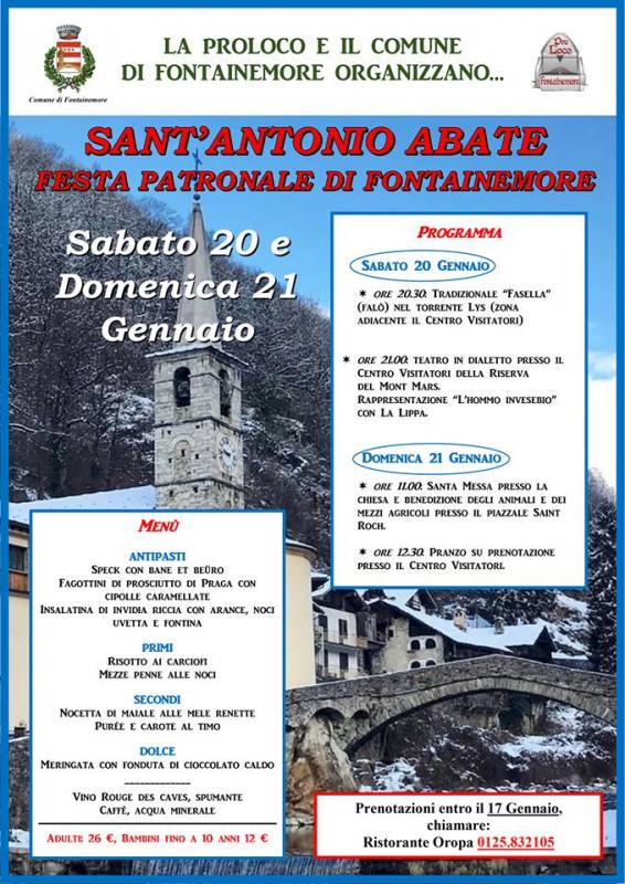 Sabato 20 e domenica 21 gennaio 2018 si svolgono i festeggiamenti in onore del Santo Patrono di Fontainemore, Sant’ Antonio Abate.
