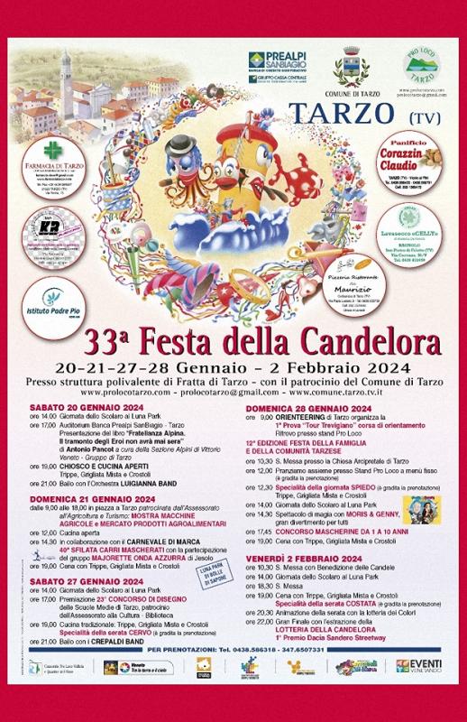 La Pro Loco di Tarzo organizza anche la Festa della Candelora di Tarzo con eventi che si svolgono il 20-21-27-28 Gennaio e 02 Febbraio 2024.