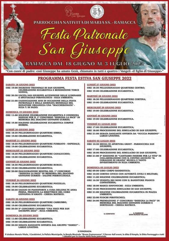 A Ramacca in provincia di Catania si svolge nei giorni dal 18 Giugno al 03 Luglio 2022 la tradizionale Festa di San Giuseppe a Ramacca.