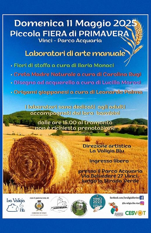 Domenica 11 Maggio ritorna la Piccola Fiera di Primavera dedicata alle tradizioni popolari con musica, fiabe, lavori manuali per festeggiare il ritorno della Primavera, con i colori, i sapori, i profumi della natura, nel poetico Parco Acquaria in Via Belvedere a Vinci.