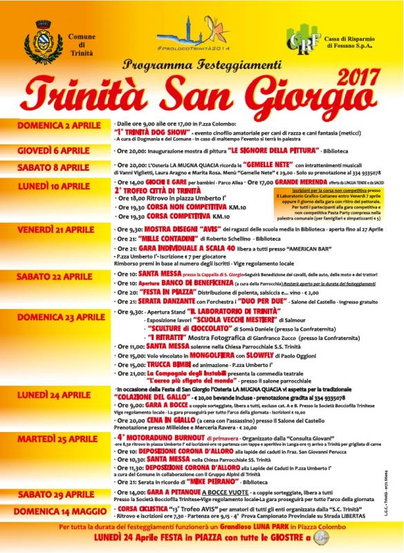 Da domenica 2 aprile a domenica 14 maggio 2017 si svolgono i Festeggiamenti per San Giorgio nella città di Trinità (CN).