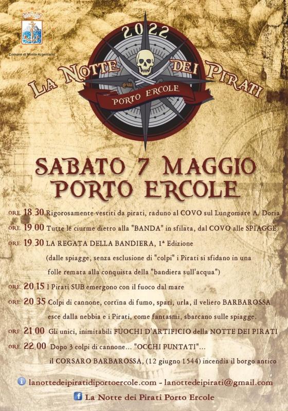Un paese che per una notte si trasformerà in un vero e proprio covo dei pirati, con tanto di caccia al tesoro. Vie, locali, spiagge, ogni angolo del porto diventerà un vicolo dove si potranno fare brutti incontri o una locanda dove non ci meraviglierà di incontrare, stravaccati davanti ad una pinta di rum (o anche altro) Long John Silver, Henry Morgan, Barbanera, Jack Sparrow o un altro dei poco raccomandabili personaggi che siamo abituati ad immaginarci in una sperduta isola dei Caraibi. Solo che questa volta sarà meglio non starsene alla larga e invece …... PARTECIPARE.
