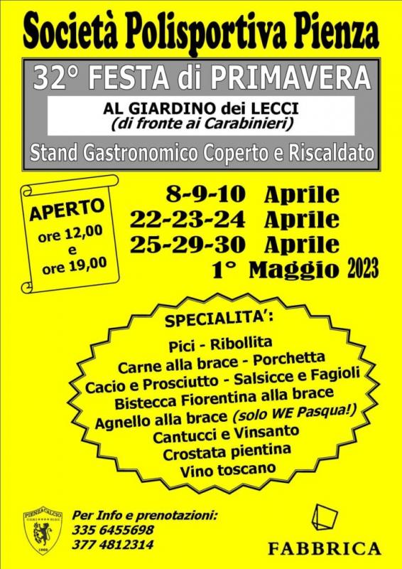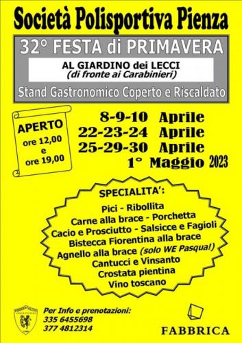 Giardino dei Lecci e Polisportiva Pienza invitano alla Festa di Primavera dove si potranno gustare specialità tipiche toscane sotto gli stand nei giorni dal 8 Aprile al 01 Maggio 2023.