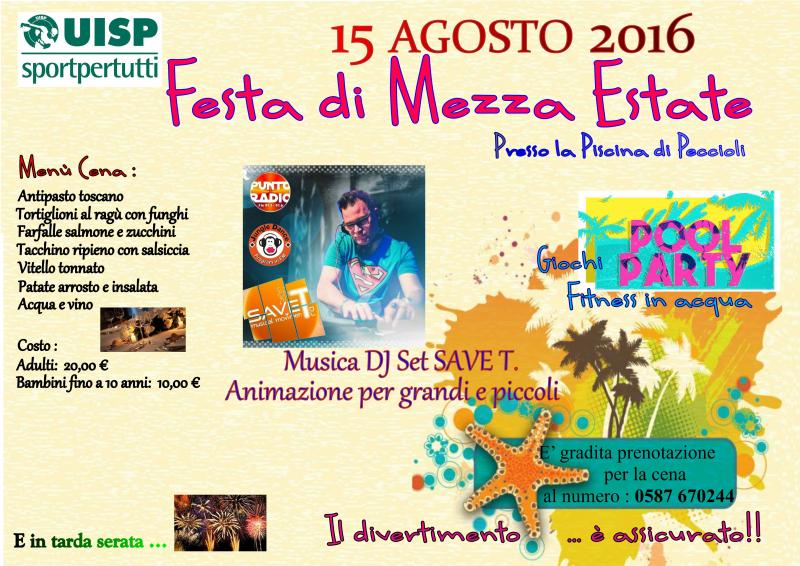 Lunedì 15 Agosto 2016 La Uisp Valdera organizza LA FESTA DI MEZZA ESTATE all'interno della piscina comunale di Peccioli.