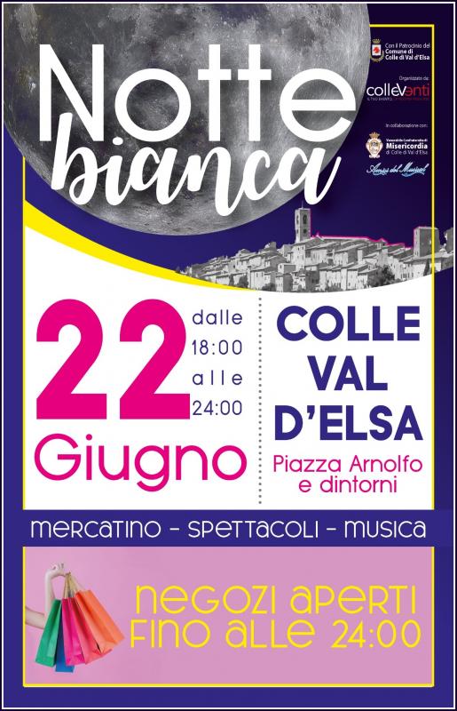 In Piazza Arnolfo e dintorni a Colle Val d'Elsa in provincia di Siena si svolge nella giornata di Mercoledì 22 Giugno 2022, dalle ore 18.00 alle ore 24.00, la nuova edizione della Notte Bianca.