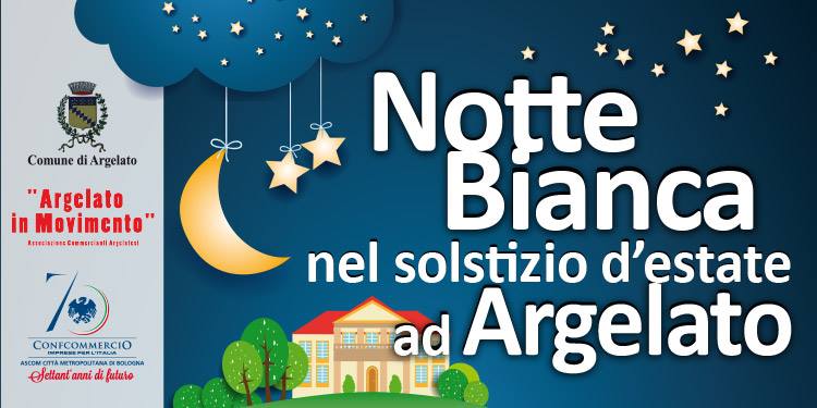 Festa di strada ad Argelato nel soslstizio d'estate, dall'ora dell'aperitivo alla mezzanotte. Si tratta della Notte Bianca di Argelato con musica dal vivo, esibizioni sportive, negozi aperti, spettacoli di danza e scuole di ballo, animazione e giochi di bambini, magia e illusionismo.