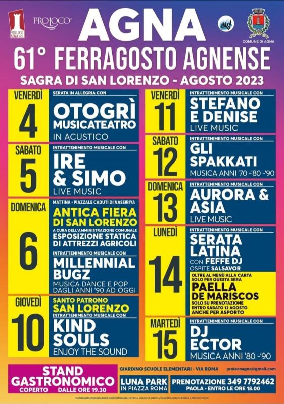 La Pro Loco Agna (PD) e l' Amministrazione Comunale Vi invitano al Ferragosto Agnese con la 60° Sagra di San Lorenzo nei giorni 4, 5 , 6, 10, 11-12-13-14-15 Agosto 2023