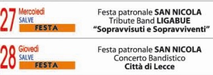Per la Festa di San Nicola a Salve il 27 e 28 luglio 2016 ci saranno serate di musica con tribute band di ligabue e concerto bandistico.