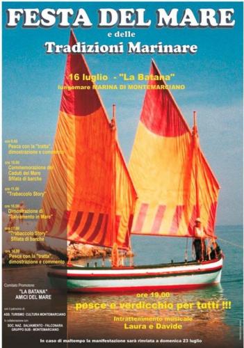 L' Associazione Pesca Sportiva “La Batana”, con il patrocinio del l'Ass. Turismo e Cultura di Montemarciano e in collaborazione con Ass. Amici del Mare, A.V.I.S. di Montemarciano, Società Nazionale di Salvamento di Falconara Marittima, CMAS Sub Sea Scout Ancona, nell’area in concessione in Via Lungomare, 137 Marina di Montemarciano, avrà luogo la “Festa del Mare e delle Tradizioni Marinare” 2017.