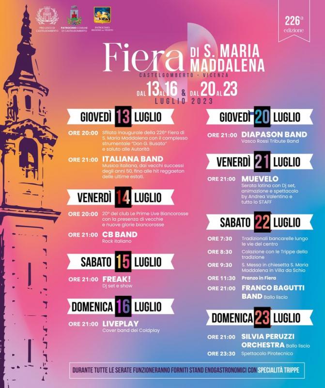 Dal 13 al 16 e dal 21 al 23 lugliosi svolgerà a Castelgomberto l'Antica Fiera di Santa Maria Maddalena, giunta quest'anno alla 226° edizione.