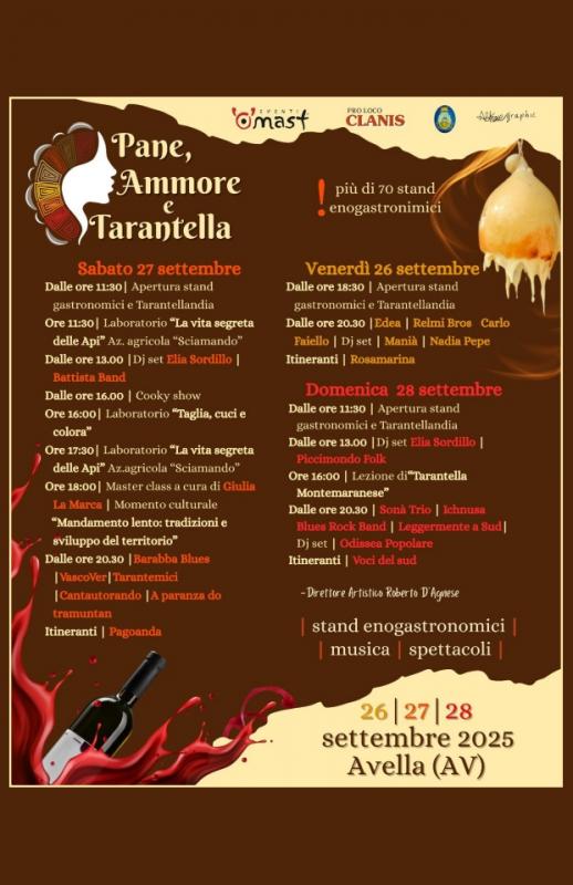 L’evento “Pane Ammore e Tarantella” si svolge nel centro storico di Avella Città d’Arte in provinciadi Avellino, nella meravigliosa Valle del Clanio, polmone verde della bassa Irpinia. La cittadina è situata al centro della Campania a confine con la provincia di Napoli, è raggiungibile in poco tempo e ben collegata con tutte le città e province della Campania. I giovani che organizzano,dal 2011, questo importante evento sono molto legati al simbolismo. Il pane è simbolo dell’unione e della famiglia ma anche della tradizione culinaria. L’amore invece racchiude un po’ tutto: la vita,la passione,il calore e l’attaccamento alle proprie radici, alla propria terra. La tarantella simboleggia l’armonia ovvero il ritmo che seguono i giovani e quindi l’entusiasmo che riescono a diffondere tra la gente che vi partecipa.