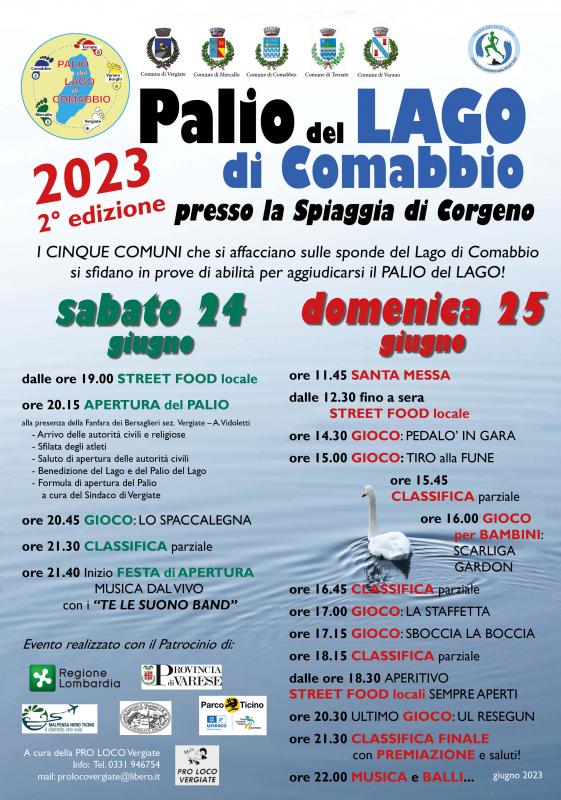 il 24 e 25 giugno 2023 I cinque comuni che di affacciano sul Lago di Comabbio si sfidano in prove di abiltà per aggiudicarsi il Palio del Lago 2023 presso la spiaggia di Corgeno, A cura della Pro Loco Vergiate, Comune di Vergiate, Comune di Mercallo, Comune di Comabbio, Comune di Ternate, Comune di Varano.